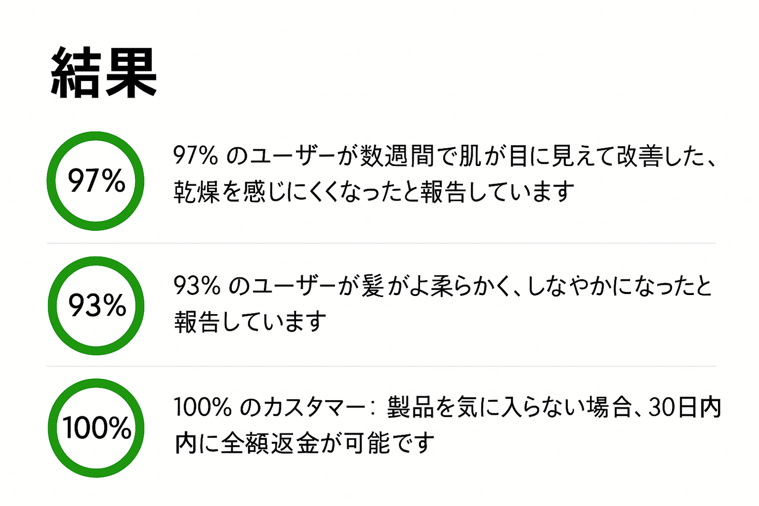 多くのお客様から、使い始めてすぐに髪がなめらかに、肌がしっとりするのを感じたという声をいただいています。 数週間使い続けることで、肌や髪の質感や健康状態がさらに整っていくのを実感いただけます。