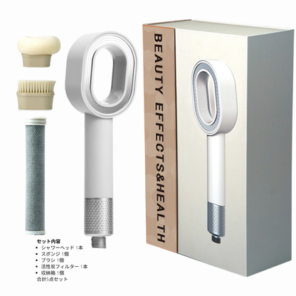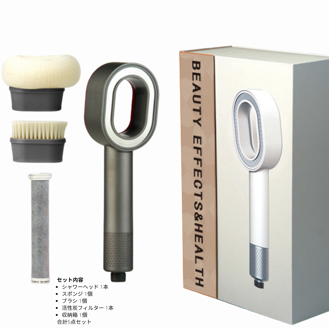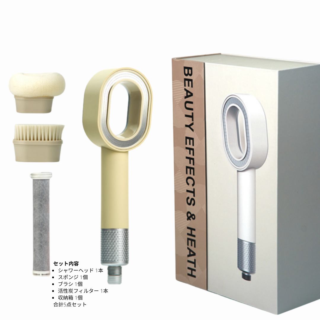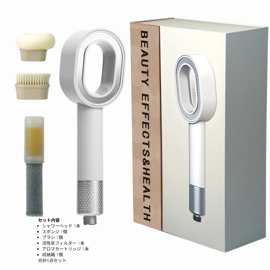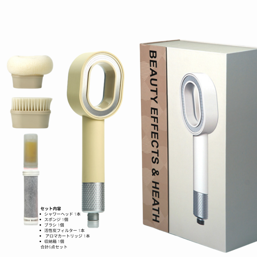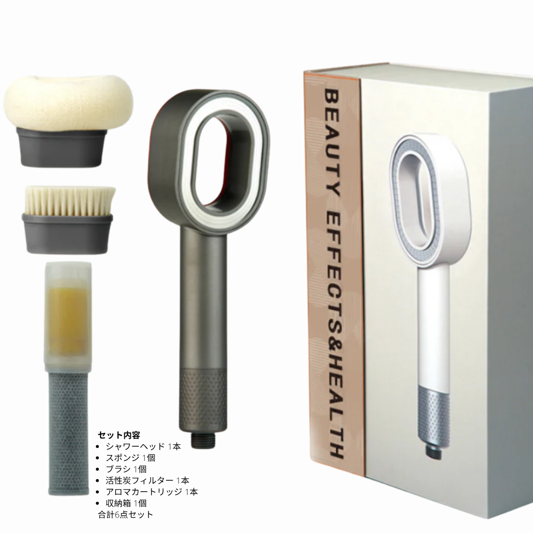 SuiGlow™は、お客様のニーズに合わせてお選びいただける2種類のセットをご用意しています。 フルキット(6点セット) プレミアムシャワーヘッド、活性炭フィルター、スポンジ、ブラシ、レモンアロマカートリッジ、収納箱。 シンプルキット(5点セット) プレミアムシャワーヘッド、活性炭フィルター、スポンジ、ブラシ、収納箱。 ブラシ・スポンジ、活性炭フィルター、アロマカートリッジは、別売りでもご購入いただけます。 いつでも心地よいシャワータイムをお楽しみください。 なお、活性炭フィルターには2種類あり、アロマカートリッジと一緒に使う「ショートタイプ」と、単独で使う「ロングタイプ」がございます。